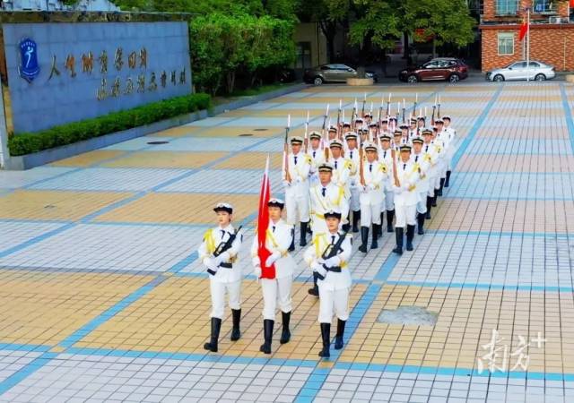 华南农业大学在行政楼广场举行庄严的升旗仪式,许多师生自发来到广场前,见证五星红旗冉冉升起的庄严时刻。国旗护卫队步伐整齐,脚步铿锵。