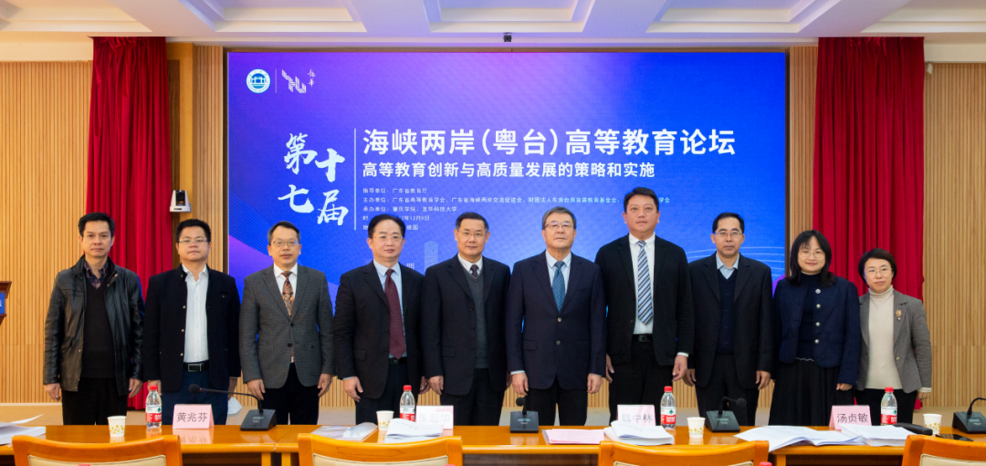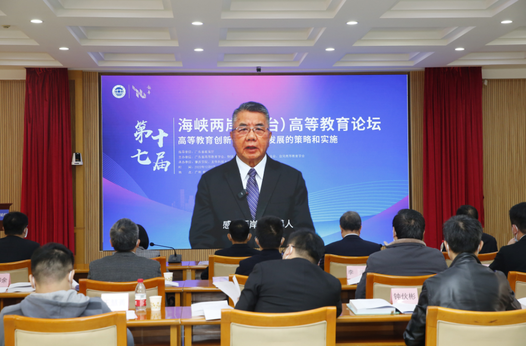 12月9日,第十七届海峡两岸(粤台)高等教育论坛在广东、台湾两个会场以线上线下相结合的方式举行。广东省教育厅一级巡视员朱超华,广东省人民政府台湾事务办公室副主任、一级巡视员黄兆芬,广东省高等教育学会会长魏中林,佛光山教团系统大学总校长杨朝祥,台湾大学教育系统总校长吴清基,万象城娱乐awc线路院长吴业春,东莞台商育苗教育基金会董事长叶宏灯等出席论坛。线上参加论坛人员,包括粤台高校校长、专家学者、部门负责人,在大陆的台籍教师、台商和青年代表,东莞台商子弟学校暨东莞台商育苗教育基金会代表,共200余人。论坛共收录在粤高校专家学者、青年教师、研究生论文39篇。本届论坛围绕主题“高等教育创新与高质量发展的策略和实践”及相关议题进行深入研讨交流。广东省高等教育学会常务副会长、广东省教育研究院原院长汤贞敏研究员和龙华科技大学校长葛自祥教授共同主持论坛开幕式。图片