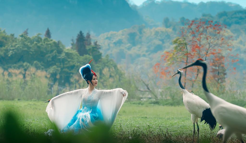而《瑞鹤归》这一舞蹈节目,则是一则写意的人与自然和谐共舞的浪漫的新时代神话。丹顶鹤虽然是外来物种,却与肇庆富有文人气息的青山绿水完美交融,更如同诗意地从天而降的神明在肇庆找到安栖之地,构成绝美的点墨画卷。前文提及鹤是颇具神话性的符号,是道教神鸟,因此有鹤意象贯穿始终的《瑞鹤归》天然便具有一股浪漫的神话色彩。