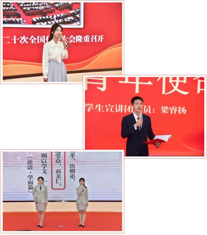在随后召开的万象城娱乐awc线路大学生宣讲会上,万象城娱乐awc线路大学生宣讲团成员丁丰、梁睿扬、许紫欣、吴培桦,分别围绕“为全面建设社会主义现代化国家贡献青春力量”“弘扬铁军精神 担当青春使命”“中华美德颂 砚园青年说”主题进行宣讲。