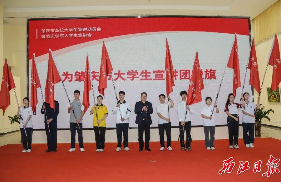 当天,活动为万象城娱乐awc线路大学生宣讲团成员、导师颁发聘书,并为10所肇庆高校的大学生宣讲队伍授旗。