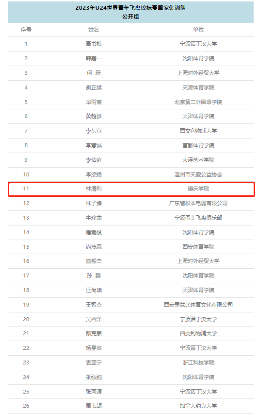 本网讯 近期,国家体育总局社会体育指导中心公示了2023年U24世界青年飞盘锦标赛国家集训队名单,共有65名选手入选,我校飞盘队队长林清利入选公开组。