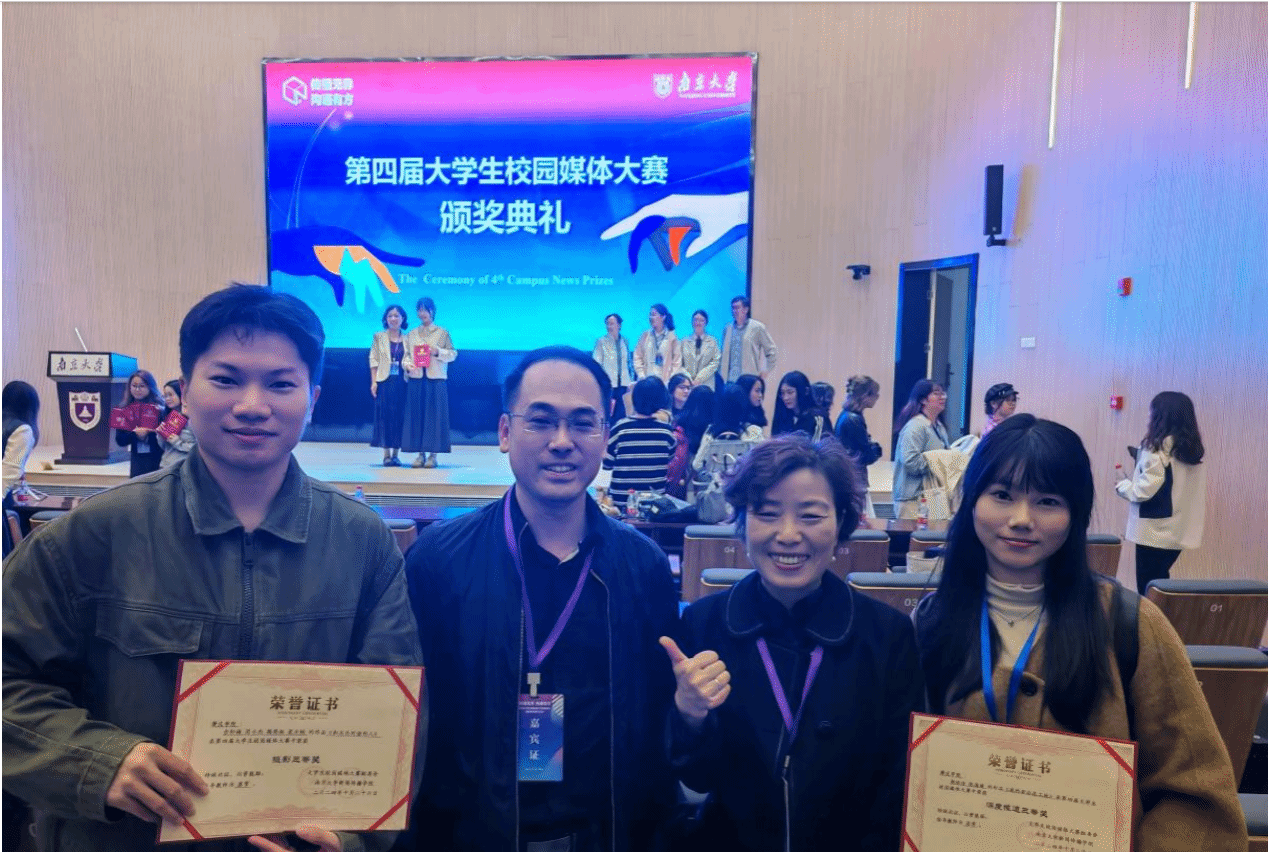 本网讯 10月26日,第四届大学生校园媒体大赛颁奖典礼在南京大学举行,文传学院两名广电专业学生受邀出席,并获颁深度报道类、摄影类等两个类别的三等奖荣誉。
