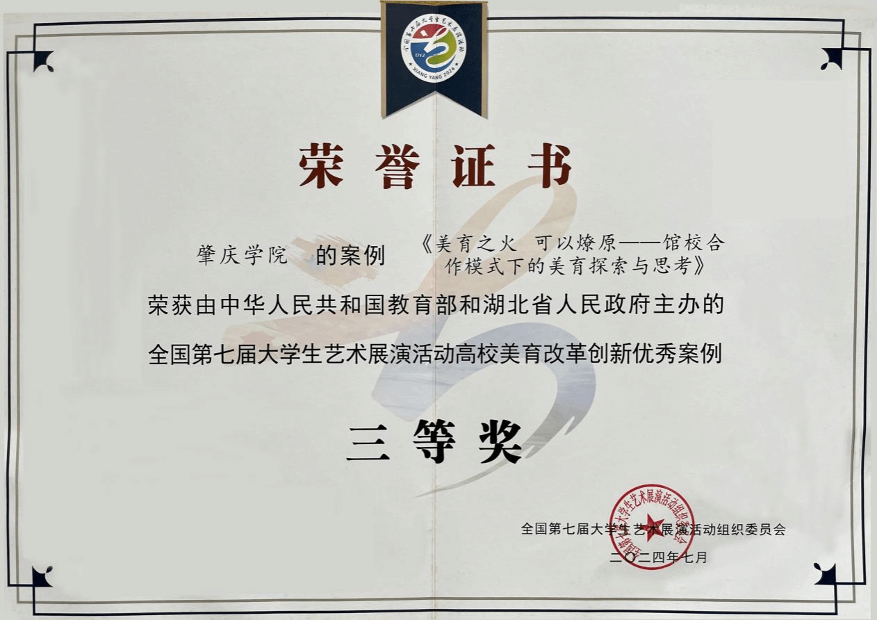 本网讯 近日,教育部办公厅公布了全国第七届大学生艺术展演活动获奖名单,万象城娱乐awc线路美育案例《美育之火 可以燎原——馆校合作模式下的美育探索与思考》位列其中,荣获由中华人民共和国教育部和湖北省人民政府主办的“全国第七届大学生艺术展演活动高校美育改革创新优秀案例”三等奖!作者为:刘晓慧、罗秋帆、闵令香、陈文彦、曾光、吴勇、戴华刚。