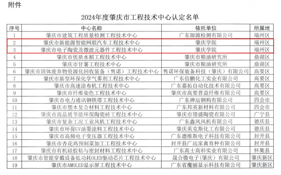 本网讯 近日,肇庆市科学技术局、肇庆市工业和信息化局联合印发了《关于认定2024年度肇庆市工程技术中心的通知》(肇科〔2025〕2号),我校成功获批两个市级工程技术中心,分别为李剑英副教授申报的《肇庆市新能源智能网联汽车工程技术中心》、陈元斌教授申报的《肇庆市电子陶瓷及微波元器件工程技术中心》。