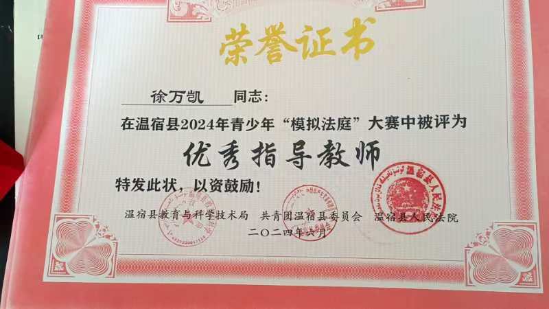徐万凯始终坚持“立德树人”的根本任务,将德育工作融入教育教学全过程。他关心爱护每一位学生,特别是对学习困难学生给予更多关注和帮助。他经常利用课余时间与学生谈心,了解他们的学习和生活情况,帮助学生解决实际困难。在他的关怀下,许多学生走出了心理困境,重新找回了自信和快乐。五年来累计资助贫困学生10名,无偿给学生提供4000余元的学习用品,家访行程累计2000余公里,帮助50余名学生解决学习困难。在2024年温宿县青少年模拟法庭大赛中,他指导学生深入研究案例,理解法律精神,将物理学科培养的逻辑思维与法庭辩论所需的严谨论证相结合。他指导的团队最终获得优异成绩,他本人也被评为优秀指导教师。
