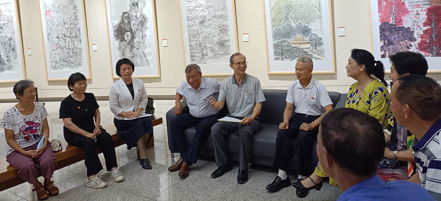 蓝世光(左五)和离退休老党员一起学习习近平总书记在庆祝建党100周年大会上的重要讲话精神