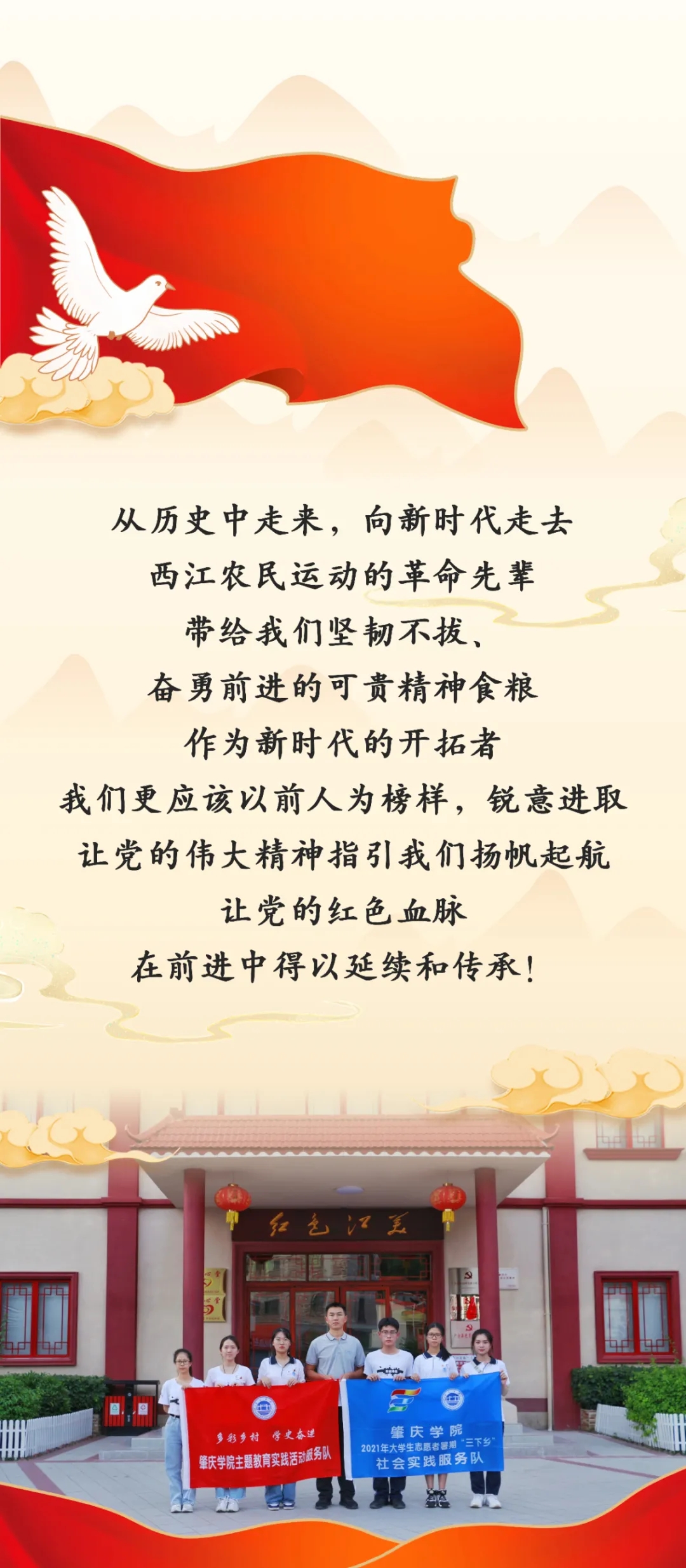 这次“三下乡”社会实践活动,我们探访了西江流域多个红色革命遗址,重温革命先辈波澜壮阔的奋斗历程,敬重之情深藏心底,自豪之感油然而生,深感自身使命担当之重大。实践团队发挥新闻中心学子专业特长,在江美村录制了“党史学习微党课”,持续讲好革命先烈的感人故事,引导学生在学习党史的过程中不断汲取前进力量,继往开来走好新时代长征路。