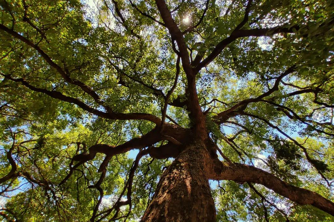 来到馆前,拾级而上,大树葱郁挺拔,粗壮的根系扎进土里汲取营养,努力地向上生长着。阳光透过绿叶的间隙,与落叶一起,细碎地撒下一片斑驳陆离。