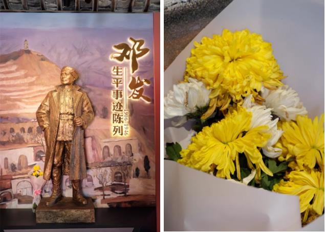 一束特殊的花静静地躺在邓发的雕像旁,它是一位后人对邓发烈士的自发纪念。时间没有遗忘我们党的好战士,邓发的红色故事、革命精神将植根于我们的红色基因里代代相传、生生不息。