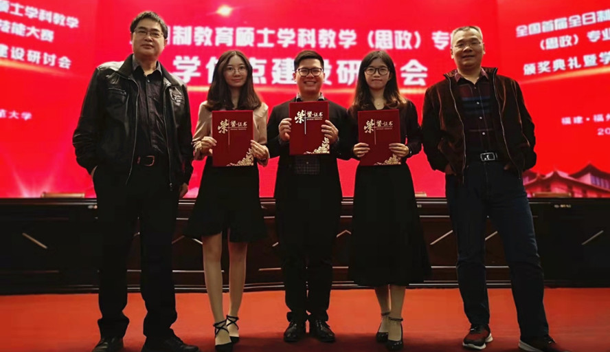 此图为苏敏瑜于2018年11月参加全日制教育硕士学科教学(思政)专业教学技能大赛,左二为苏敏瑜