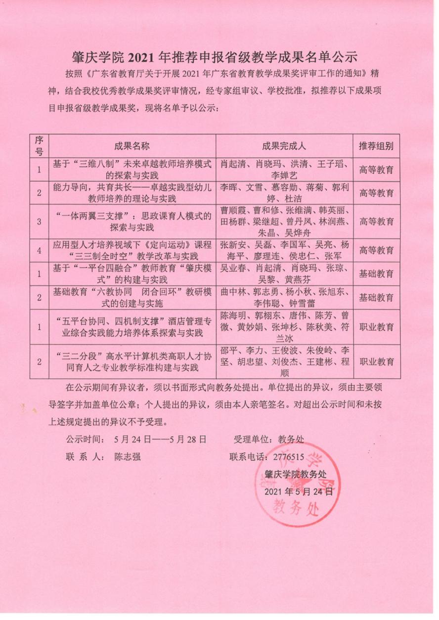 按照《广东省教育厅关于开展2021年广东省教育教学成果奖评审工作的通知》精神,结合我校优秀教学成果奖评审情况,经专家组审议、学校批准,确定推荐申报省级教学成果奖名单,具体情况如图。