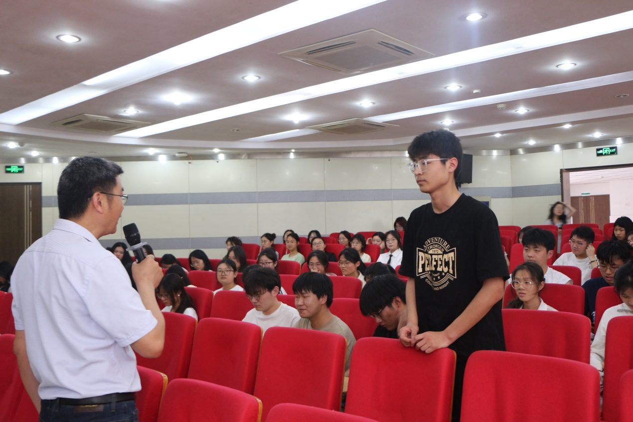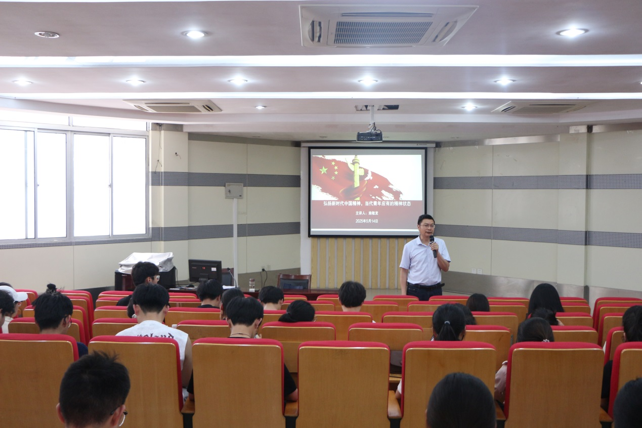 讲座中,施敏发通过分享革命先烈、科学家、工程师、劳动模范、大国工匠们的故事,通过分享安徽省高等学校科学研究重点项目“大中小学思政课一体化传承弘扬中国精神的路径和策略研究”的部分成果等,让在场师生们对中国精神有了更为直观的认知;围绕“中国精神具体表现在哪里”“新时代青年应有的姿态”等问题,与学生互动,气氛热烈。同时,讲座也指出了“躺平”“摆烂”等现象背后的生命意义缺失和精神危机,号召在场青年挺起中国精神的脊梁,拒绝躺平,勤勉实干,争做中国精神的传承者和弘扬者。