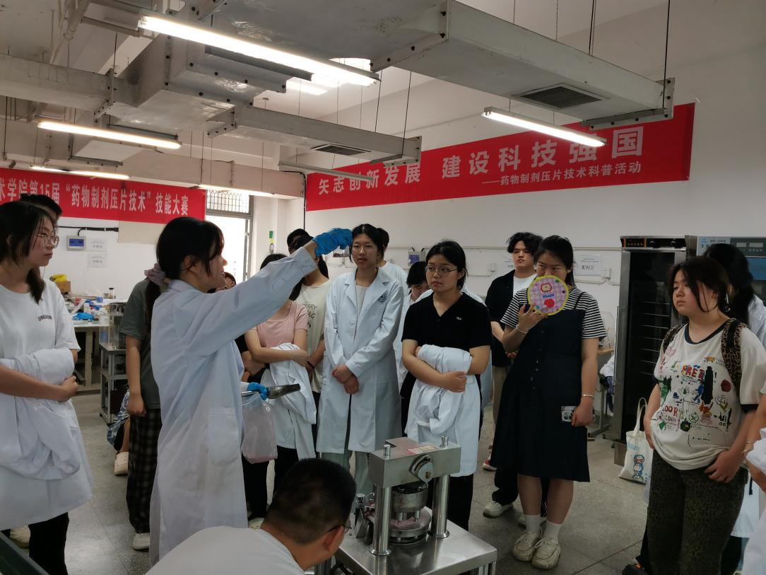 为积极响应2025年安徽省科技活动周“矢志创新发展 建设科技强国”主题号召,6月5日下午,生物工程学院在生化楼制剂中心成功举办了一场别开生面的“药物制剂压片技术”科普展示活动。本活动聚焦药品生产领域的核心技能,通过不同模拟场景展示固体制剂片剂如何从物料到成品过程,体现了现代制药技术的先进性和实践应用性。活动吸引了本学院食品等专业70余人次参加。