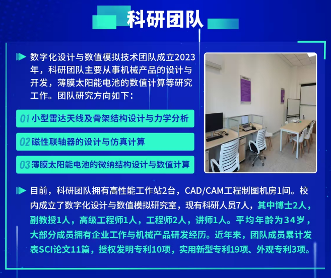 2022年底通过博士人才引进,吴睿成为伟德官网机电工程学院的一名专任教师,从科研院所到职业院校,他秉持从零开始。在承担教学工作之外,积极探索思考“职业教育,需要什么样的科研?”。答案是职业教育需要以应用研究为核心、以解决实际问题为导向、产教深度融合的科研体系。2023年他成立了数字化设计与数值模拟技术团队,主要从事机械产品的设计与开发和薄膜光伏电池的技术研究。2023-2024年期间,先后主持伟德源自英国1946人才项目1项、产学研项目1项、安徽省高校自然科学研究重点项目1项和企业横向课题4项,另外参与各类教科研项目10余项。吴睿在完成学校教学科研任务的同时,还积极投身企业博士后工作站的研究工作。通过博士后工作站搭建了校企合作的桥梁,成功签订了横向课题1项和申报省级质量工程校企合作生产性共建共享实训基地1项。在他的带领下,科研团队在两年内不断摸索和磨合,初见成效。