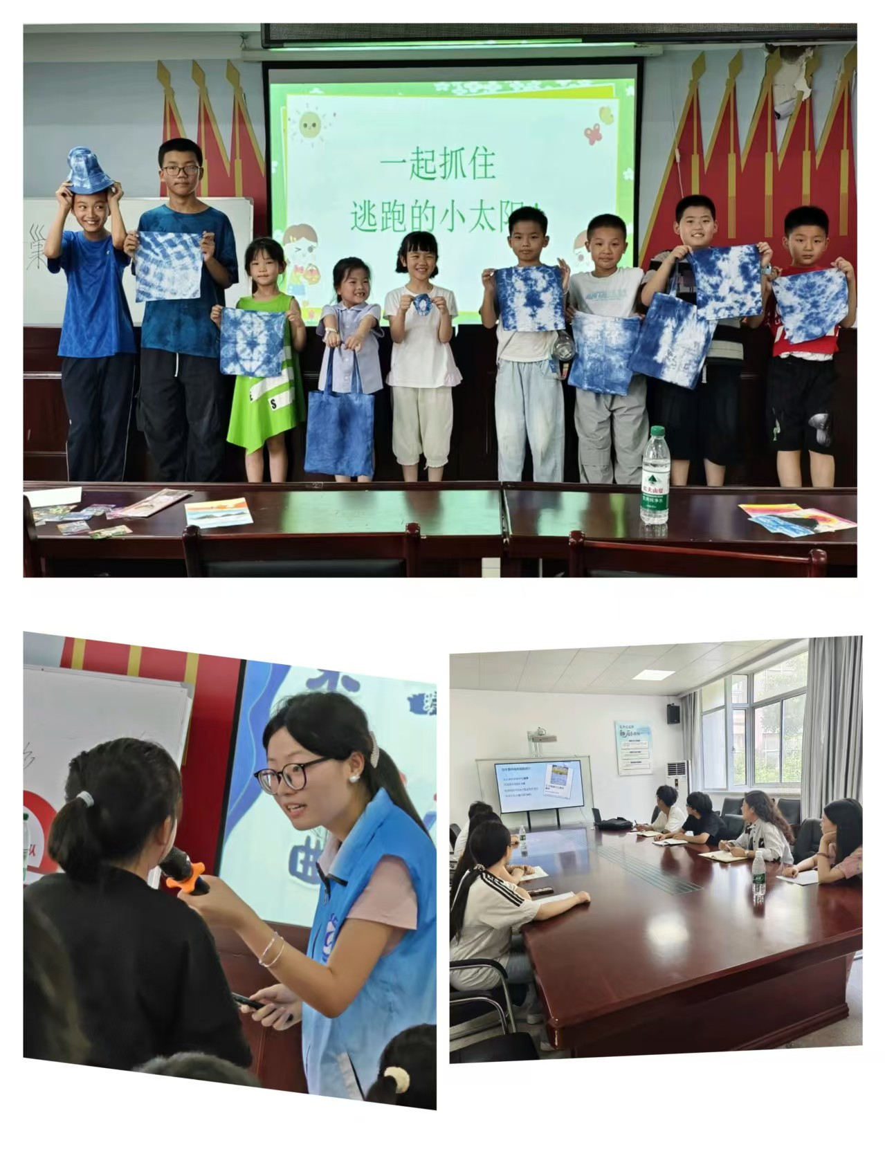 实践团成员提前两周进入备课状态,通过集体研讨、模拟授课等方式反复打磨课程细节,最终形成每日特色鲜明的课程体系。非遗小课堂上,成员们准备了白色棉布、靛蓝染料和捆扎工具,从扎结手法到染色技巧层层递进教学。孩子们专注地将棉布折成扇形,用皮筋捆出星星、蝴蝶等图案,当浸泡在染料中的织物逐渐显现花纹时,课堂里响起阵阵欢呼。小朋友们举着自己的扎染手帕说:“我要把这块手帕送给妈妈当礼物。”