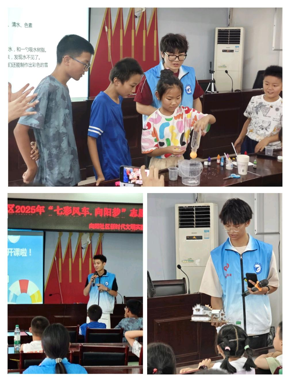 安全与科学课程同样亮点纷呈。实践团成员介绍防震知识,扮演“应急指挥员”,指导孩子们在警报声中快速抱头蹲躲到课桌下,随后带领他们有序撤离;防溺水教学通过情景短剧形式,生动演示了“不慎落水如何自救”“发现他人溺水勿盲目施救”等要点。科学小课堂的“大气压实验”更是引爆全场,当乒乓球放在装满水的饮料瓶口上并倒置水瓶时,滴水未洒,孩子们瞪大双眼发出惊叹,纷纷举手要求亲自尝试。