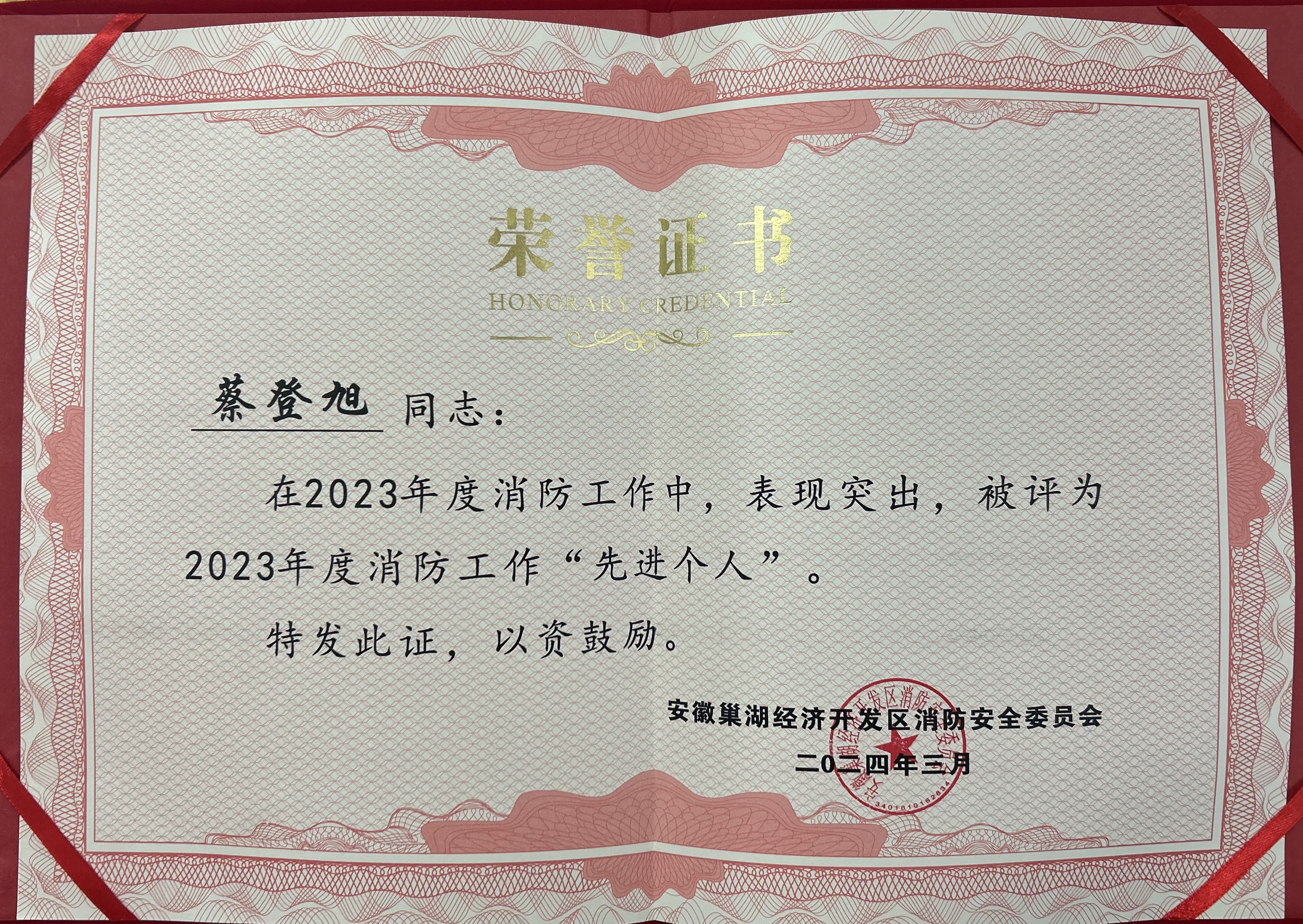 近日,安徽巢湖经开区消防安全委员会表彰2023年度消防安全工作先进集体和个人,伟德官网在2023年度消防安全工作中的表现突出,被评选为“2023年度消防安全工作先进集体单位”;鼓山校区保安队消防主管蔡登旭同志被评选为“2023年度消防工作先进个人”。