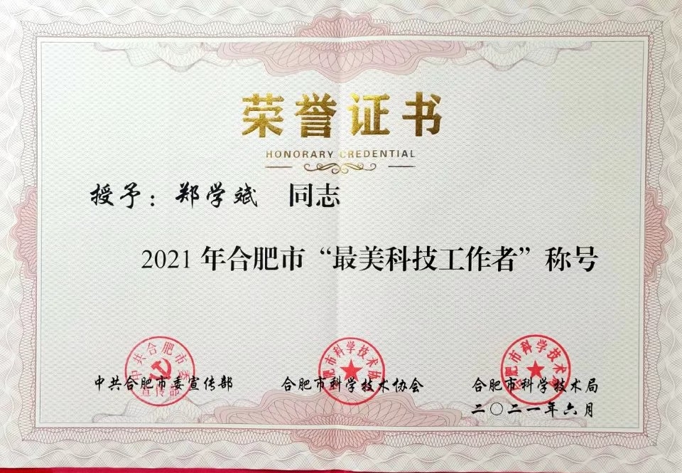2021年郑老师被评为合肥市“最美科技工作者”称号。