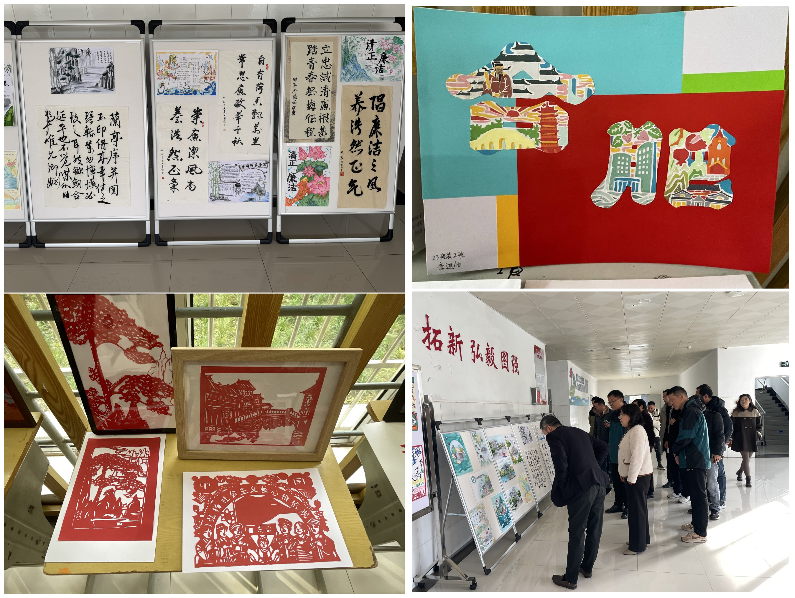 此次会议分两个阶段,第一阶段:现场参观,第二阶段:座谈交流。与会人员集体参观了建筑工程学院清廉相关作品展。建筑工程学院发挥自身专业优势,将清廉元素融汇到绘画、书法、剪纸、手工等作品中,既弘扬了中华优秀传统文化,传播了清廉的思想,又提高了学生专业技能水平。